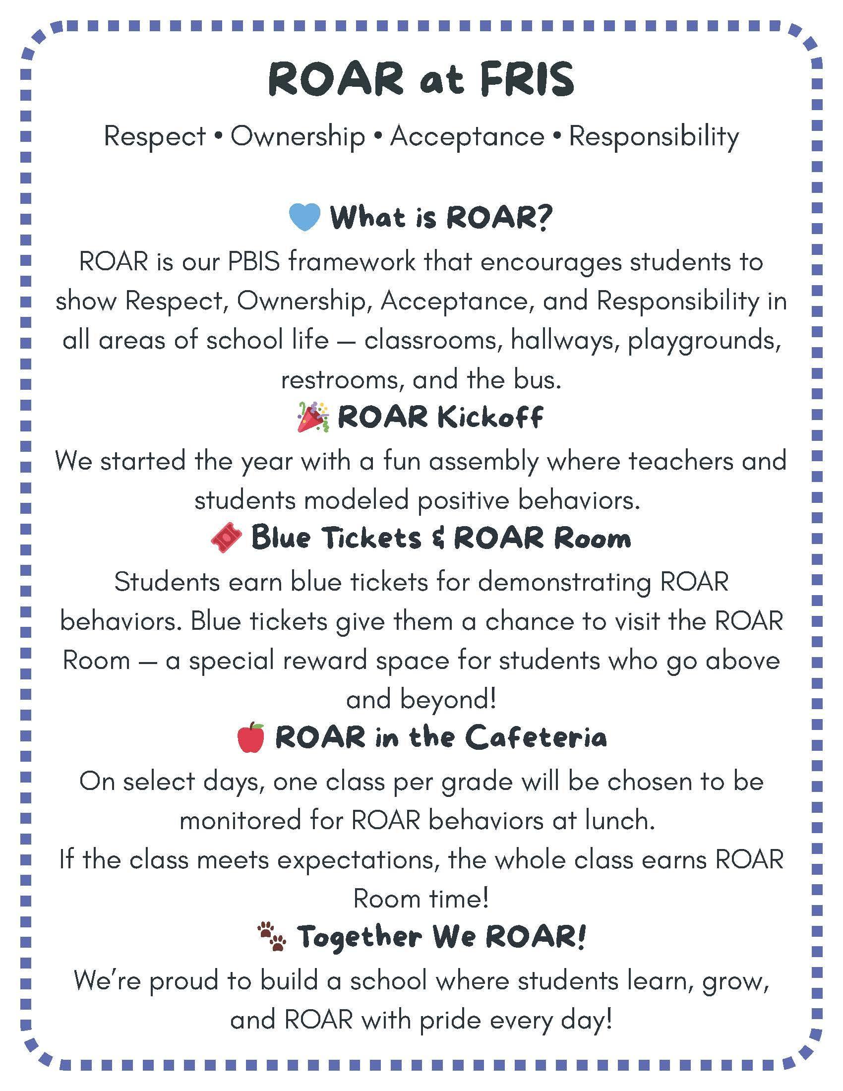ROAR is our PBIS framework that encourages students to show Respect, Ownership, Acceptance, and Responsibility in all areas of school life — classrooms, hallways, playgrounds, restrooms, and the bus.